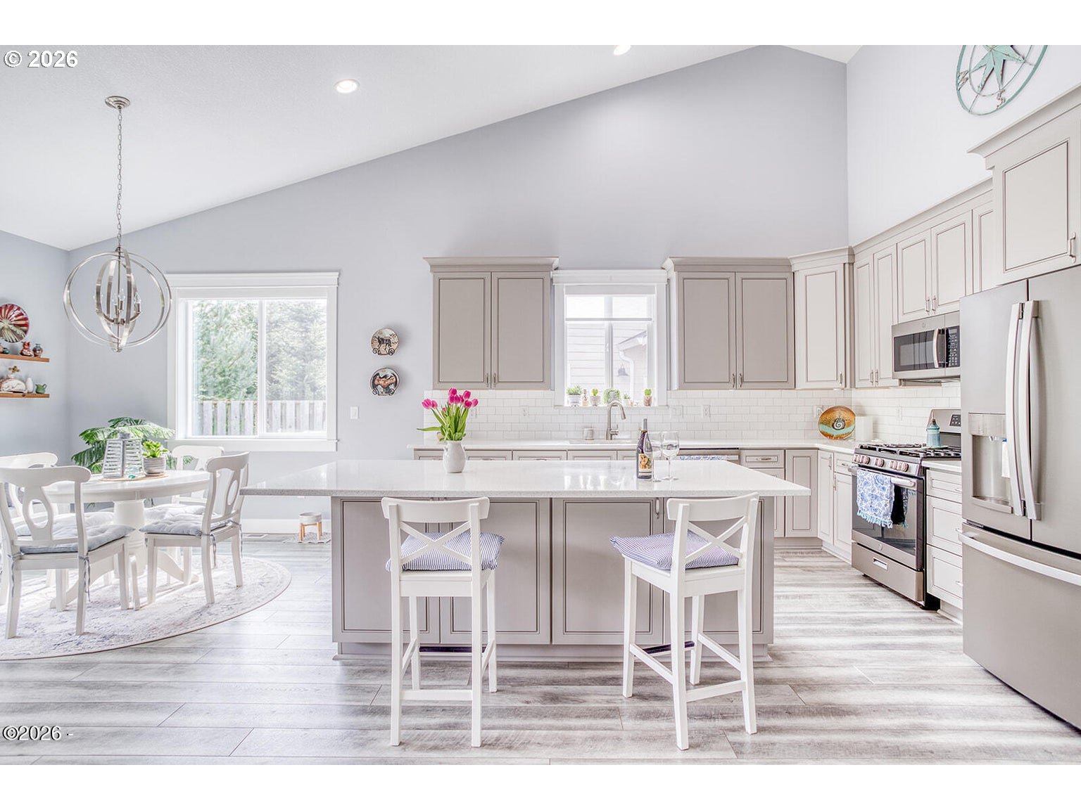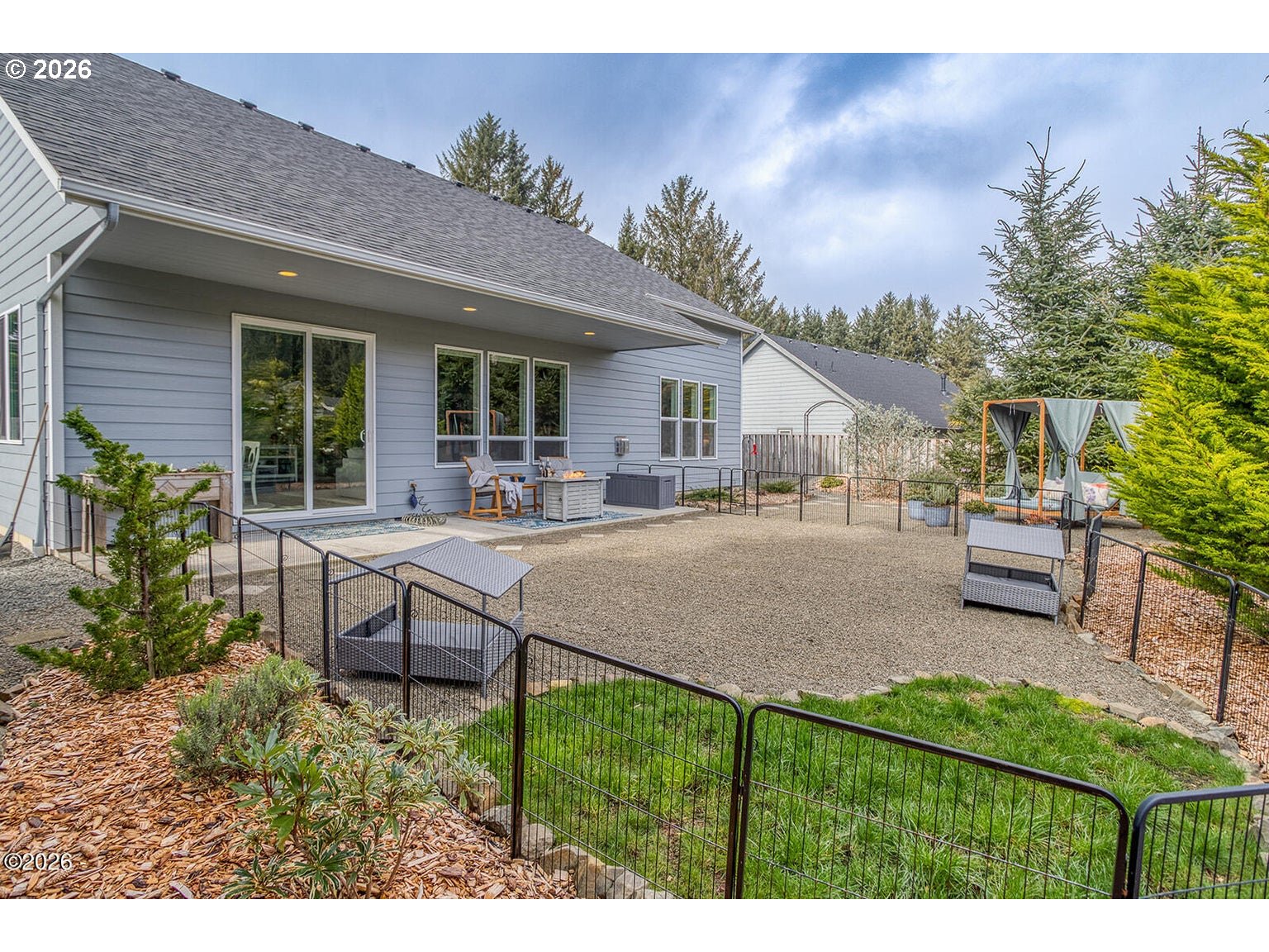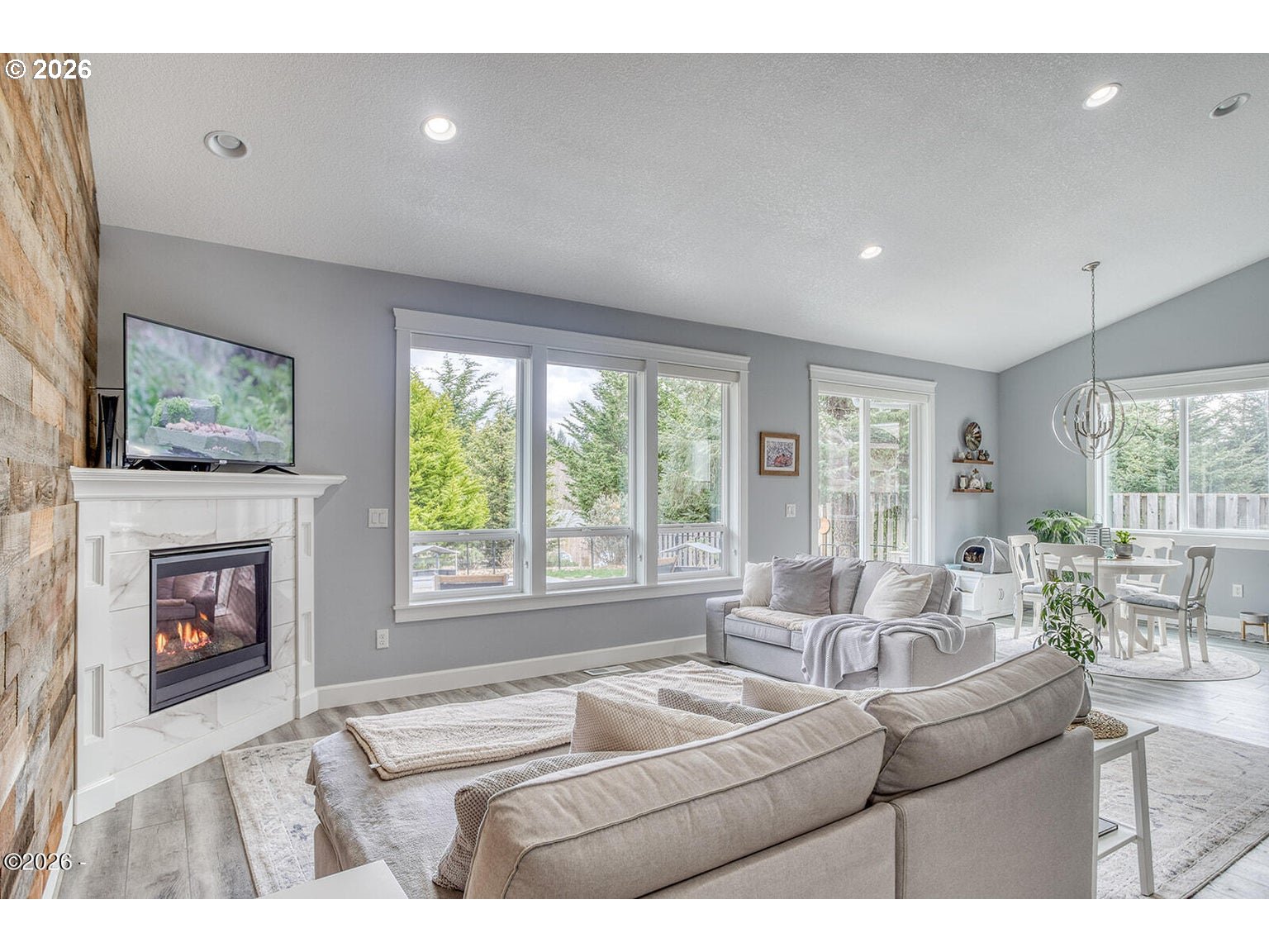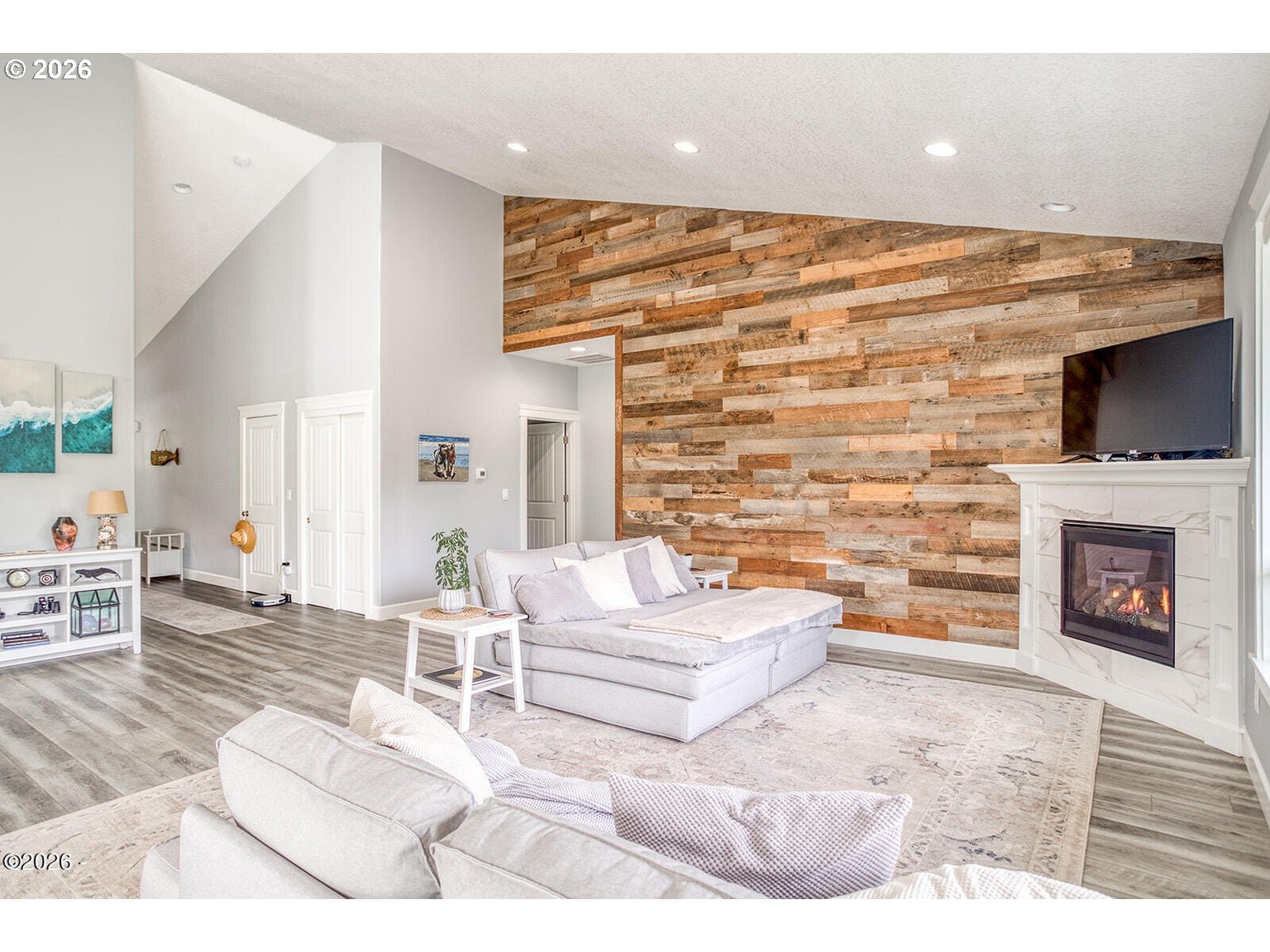 - Beautifully maintained single-level home offering move-in ready coastal living. The open-concept design features vaulted ceilings, a reclaimed barn wood accent wall, and a cozy gas fireplace. The kitchen includes a gas range, custom soft-close wood cabinetry with crown molding, quartz countertops, and a large island ideal for cooking and gathering. Matching quartz surfaces continue through both bathrooms and the laundry room. The spacious primary suite features a jetted soaking tub, dual sinks, and a large walk-in closet. Generous storage is found throughout the home with large closets and a pantry. Durable Coretec LVP flooring and extra insulation in interior walls add comfort and sound reduction. Recent improvements include central air conditioning (2023), new dishwasher (2024), new refrigerator (2025), low-maintenance landscaping (2025), and the entire exterior freshly painted (2025). The oversized electrical panel allows for future additions such as a hot tub or RV connection. The fully fenced backyard includes a covered patio, fire pit area, raised garden beds, and forest views. Custom blinds lift completely to preserve the natural scenery. Located outside the tsunami zone and just minutes from beach access at Road's End State Park via the Sal-La-Sea Trail, with nearby access to the Knoll and God's Thumb hiking trails. Two-car garage and convenient access to Lincoln City amenities.
