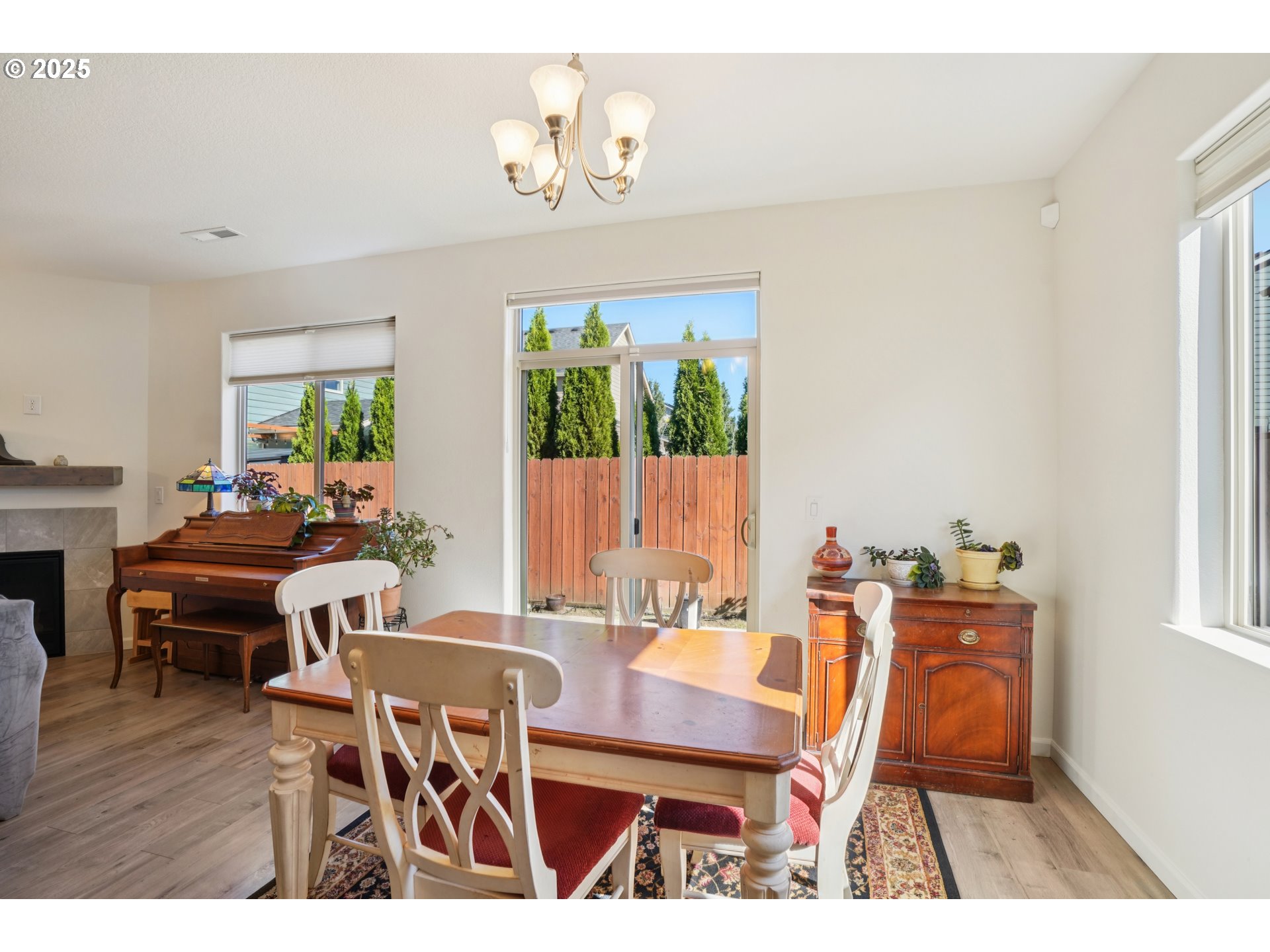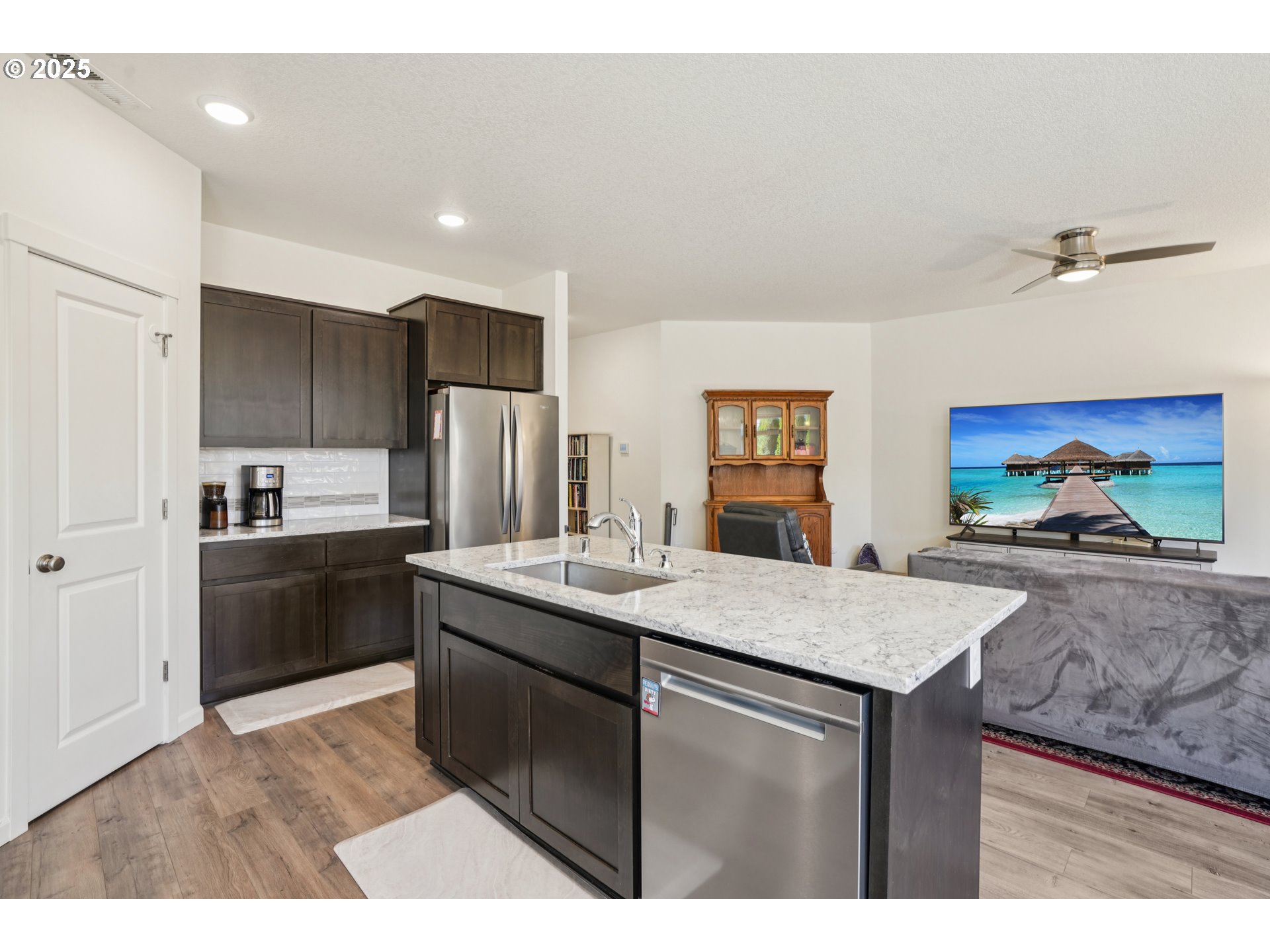 - Welcome to this beautifully maintained, move-in ready single-story home on a private road. The open concept layout features luxury vinyl plank flooring, high ceilings, stone gas fireplace, premium Stoneside blinds on all windows and a bright, airy living space with beautiful sight lines. The gourmet kitchen features a quartz island, 5-burner gass tove, deep stainless-steel sink, and walk-in pantry. Carpeted primary suite includes walk-in shower and closet. Spacious 3-car garage and an oversized laundry room for added convenience. Enjoy this quiet,serene location that offers both privacy and comfort. Mortgage savings may be available for buyers of this listing.