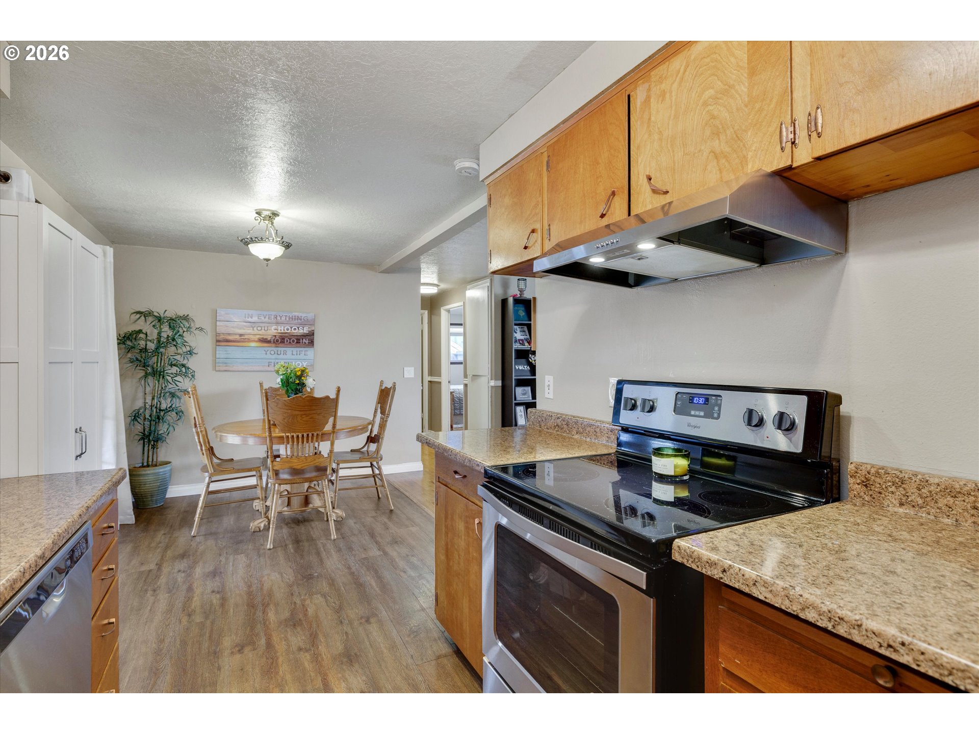 Charming and updated 2-bedroom, 1-bath home in a convenient central Hillsboro location. With 960 square feet, this inviting starter home features hardwood floors, a cozy wood stove, and thoughtful updates including the bathroom, flooring, kitchen counters, French doors, and vinyl windows. The kitchen offers original wood cabinetry with classic midcentury appeal, plus a dishwasher and included kitchen appliances. A large covered and enclosed patio with electrical provides versatile bonus space for hobbies, storage, or year-round enjoyment. Spacious backyard includes a fire pit, tool shed, and room to park a utility trailer. Attached 1-car garage adds everyday convenience. All this, plus low property taxes make this a perfect, affordable option. Located near downtown Hillsboro shops, restaurants, and transit, this home offers a great combination of charm, function, and accessibility.